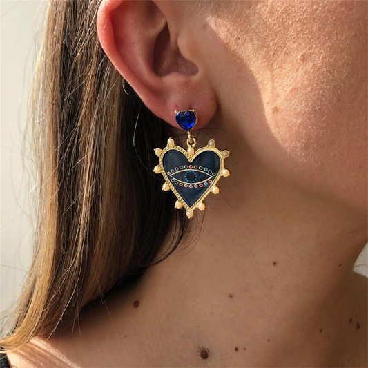 Blue Crystal & Enamel Evil Eye Heart Drop Earrings