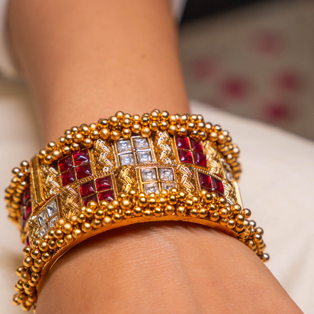 Crafted with intricate detailing, the golden frame is adorned with bold red and white stone inlays that bring out a royal vibrance. The delicate beaded edges add a touch of regality, making it the perfect companion for festive occasions, weddings, and grand celebrations.